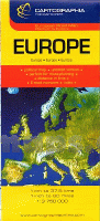 Politische Europakarte mit dichtem Straßennetz. Die Karte reicht im Osten bis Wolgograd im Norden bis Mittelskandinavien. Nordskandinavien und Island sind auf einer Sonderkarte 1:9,65 Mio abgebildet. Mit umfangreichem Ortsregister auf der Rückseite der Landkarte.