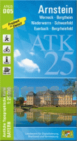 Topographische Wanderkarte für die Gegend um Arnstein mit Wanderwegen und Radwanderwegen. Für Touristik und Freizeit bietet die ATK25 in Verbindung mit einer plastischen Geländeschummerung das aktuelle Netz der Wanderwege (Rot) und Radwege (Grün). Einzelne touristische Hinweise und Symbole ergänzen die Kartendarstellung. Das eingetragene UTM-Kilometergitter gewährleistet dem GPS-Nutzer Koordinatensicherheit. Gegenüber den Rahmenblättern (herkömmliche Blätter im Regelblattschnitt) 1:25.000 stellt ein ATK25-Kartenblatt eine 3,5-fach größere Kartenfläche dar. Die einzelnen Karten haben zu Ihren Nachbarblättern einen 4 km breiten Überlappungsbereich. Blattübersicht (externer Link) Kartenbeispiel aus der Serie