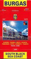 Detaillierter Stadtplan von Burgas mit Straßenverzeichnis. Außerdem Stadtpläne der umliegenden Ortschaften. Übersichtskarte der südlichen Schwarzmeerküste. Alle Texte und Beschriftungen in bulgarischer Sprache.