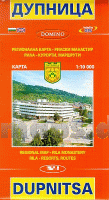 Detaillierter Stadtplan von Dupniza / Rila (Bulgarien) mit kyrillischen Straßennamen. (Größere Straßen auch mit lateinischer Beschriftung). Namen der Stadtteile, die Legende, eine kurze Ortbeschreibung und touristische Informationen auch auf englisch. Mit Umgebungskarte und kleiner Wanderkarte vom Rila-Gebirge im Bereich der Sieben Seen (Sedemte Rilski esera, Sedemte esera).